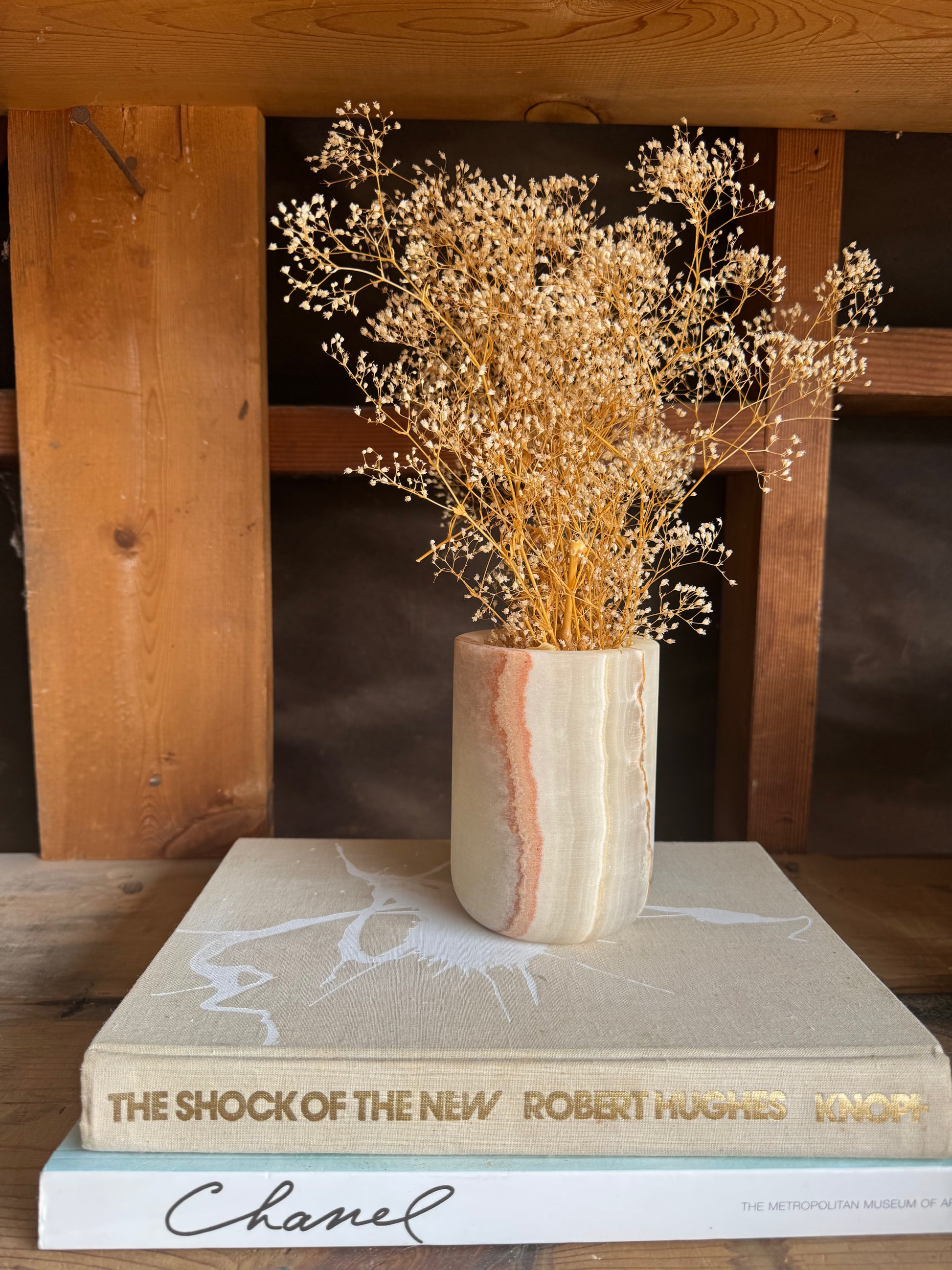 Blush, sandstone, and light — these vessels glow with quiet warmth. Carved from natural onyx into rounded, sculptural forms, they reveal layered tones of nude green, soft orange, pale pink, and natural translucency.