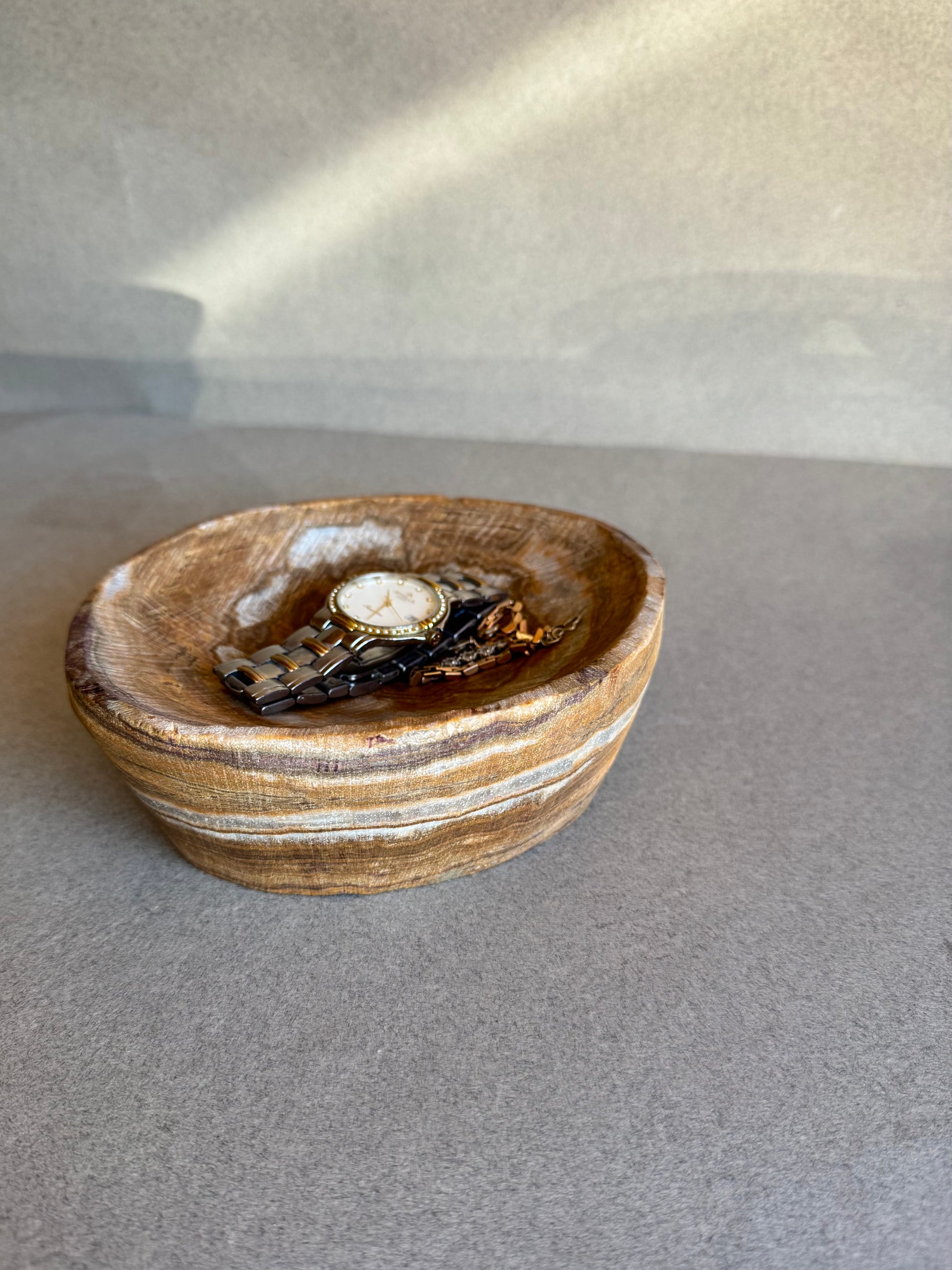 This hand-carved onyx catchall bowl carries earthy layers of brown, cream, and amber — a natural landscape revealed in stone. Compact yet sculptural, its shallow form makes it a timeless accent for holding jewelry, watches, keys, or simply standing alone as an object of stillness.