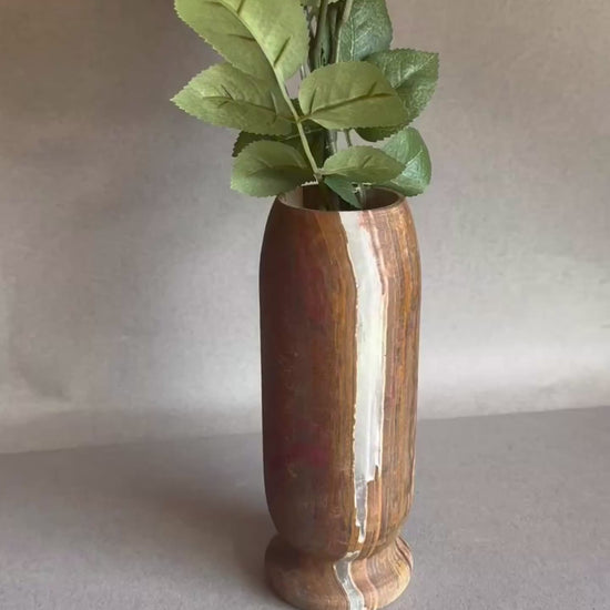 Earthy brown, caramel, and ivory veining flow through this tall onyx vase, each layer telling the story of stone shaped over centuries. Its elongated form stands with quiet strength, creating height and elegance in any room.