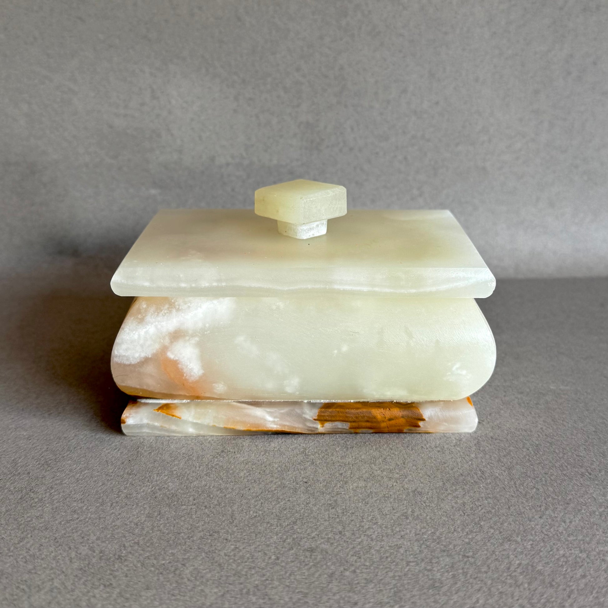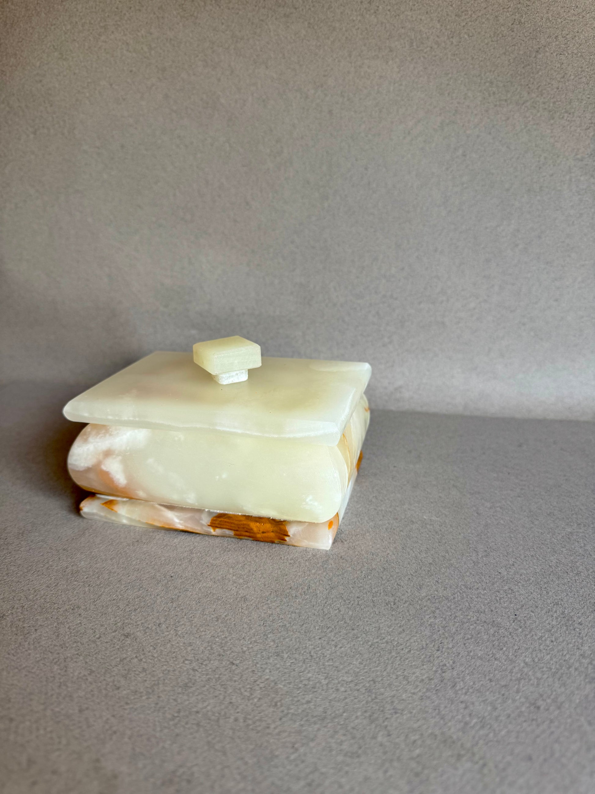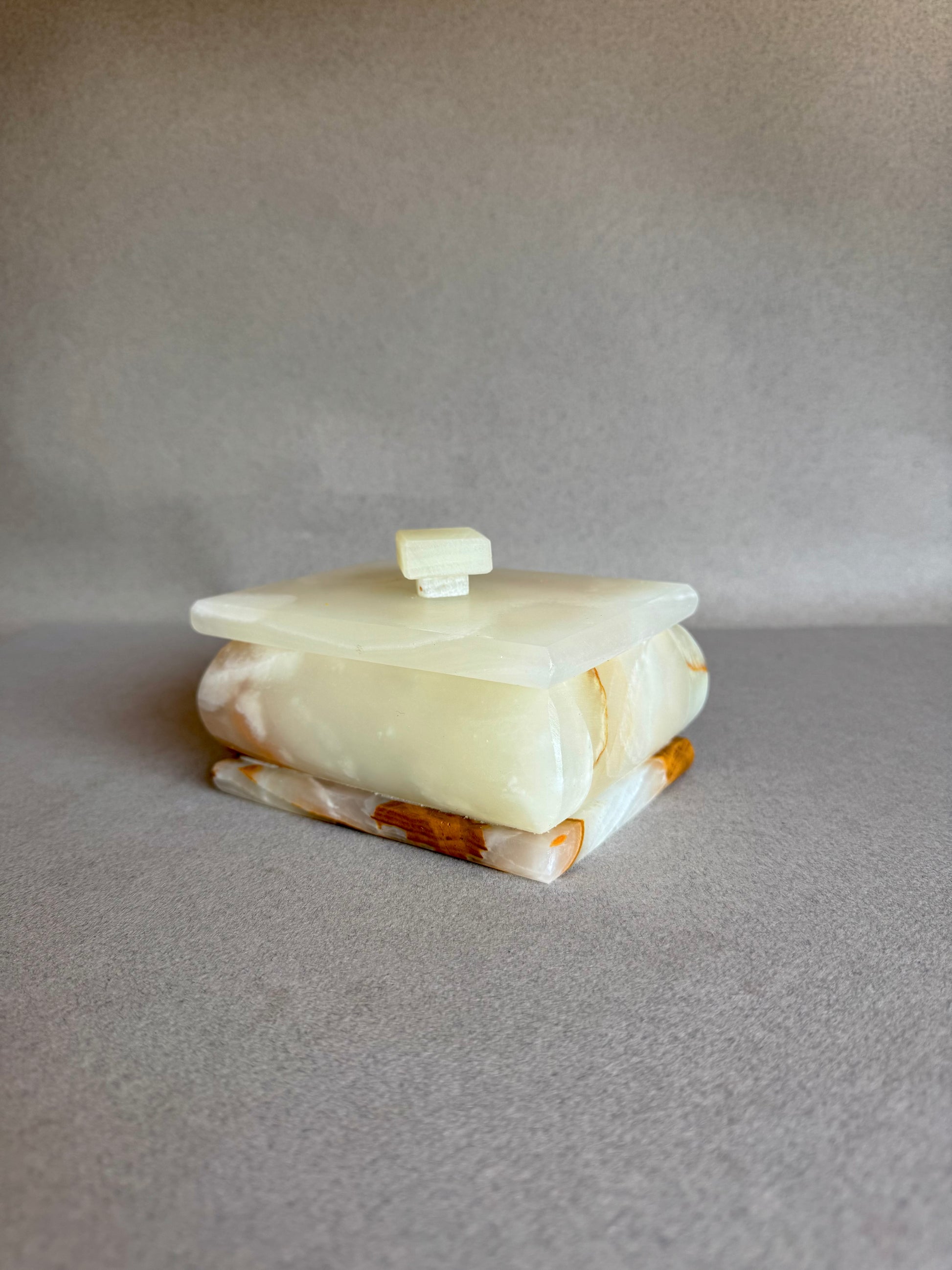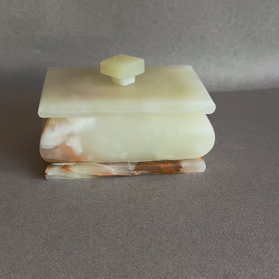 Cream, moss green, and smoky blush. This hand-carved onyx box carries the quiet grounding of the earth itself. Rectangular in form yet sculptural in presence, it is carved from a single block of natural stone with a fitted lid that rests seamlessly in place. Each vein of color holds a record of time, pressure, and mineral earth, making no two boxes ever alike.