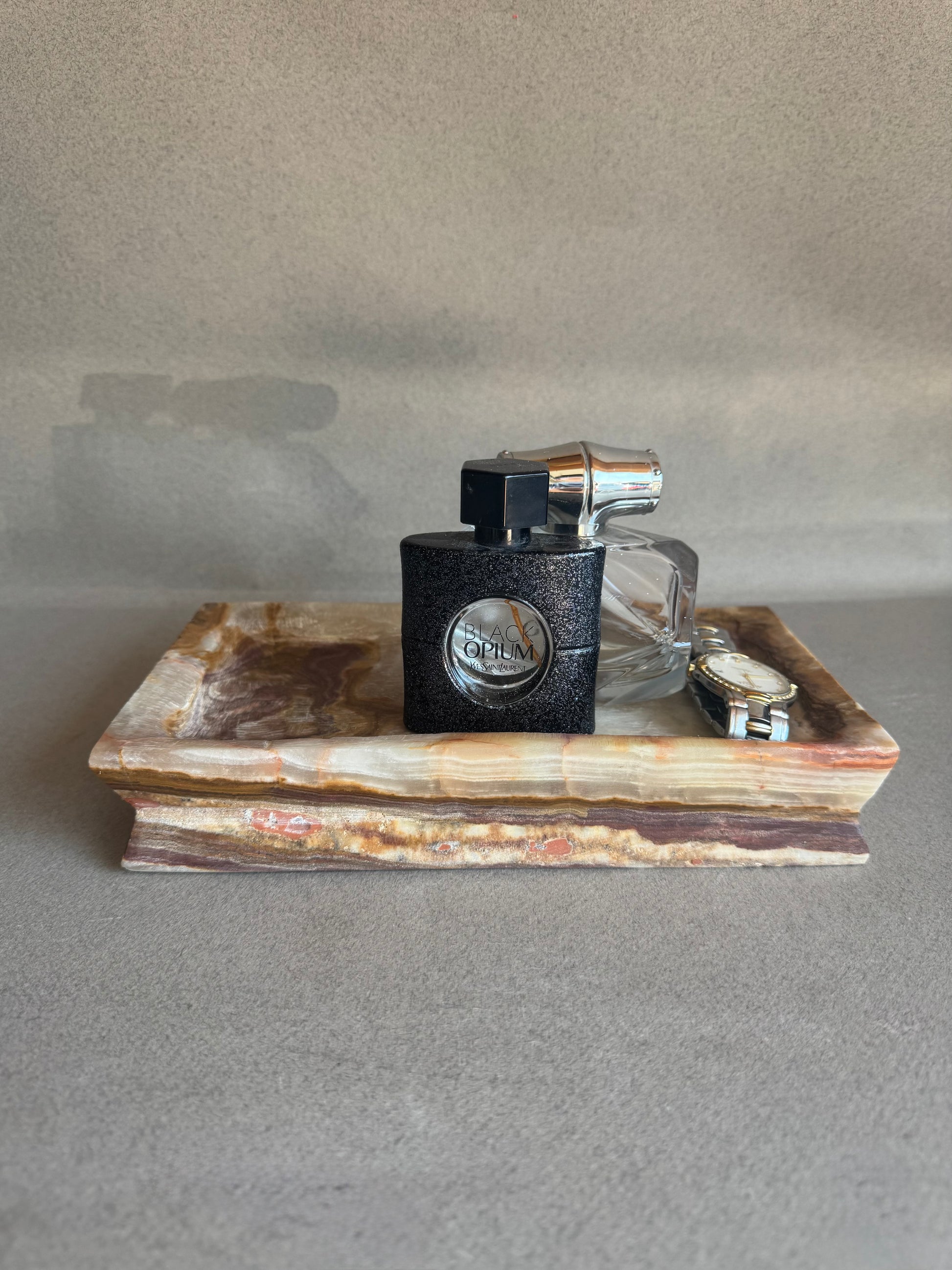 With a stepped-edge base and gently sloped interior, it’s designed to hold everyday rituals: perfume bottles, jewelry, keys, or candles. The stone’s natural glow and weight offer a calming sense of presence, whether styled in a bedroom, bathroom, or entryway.