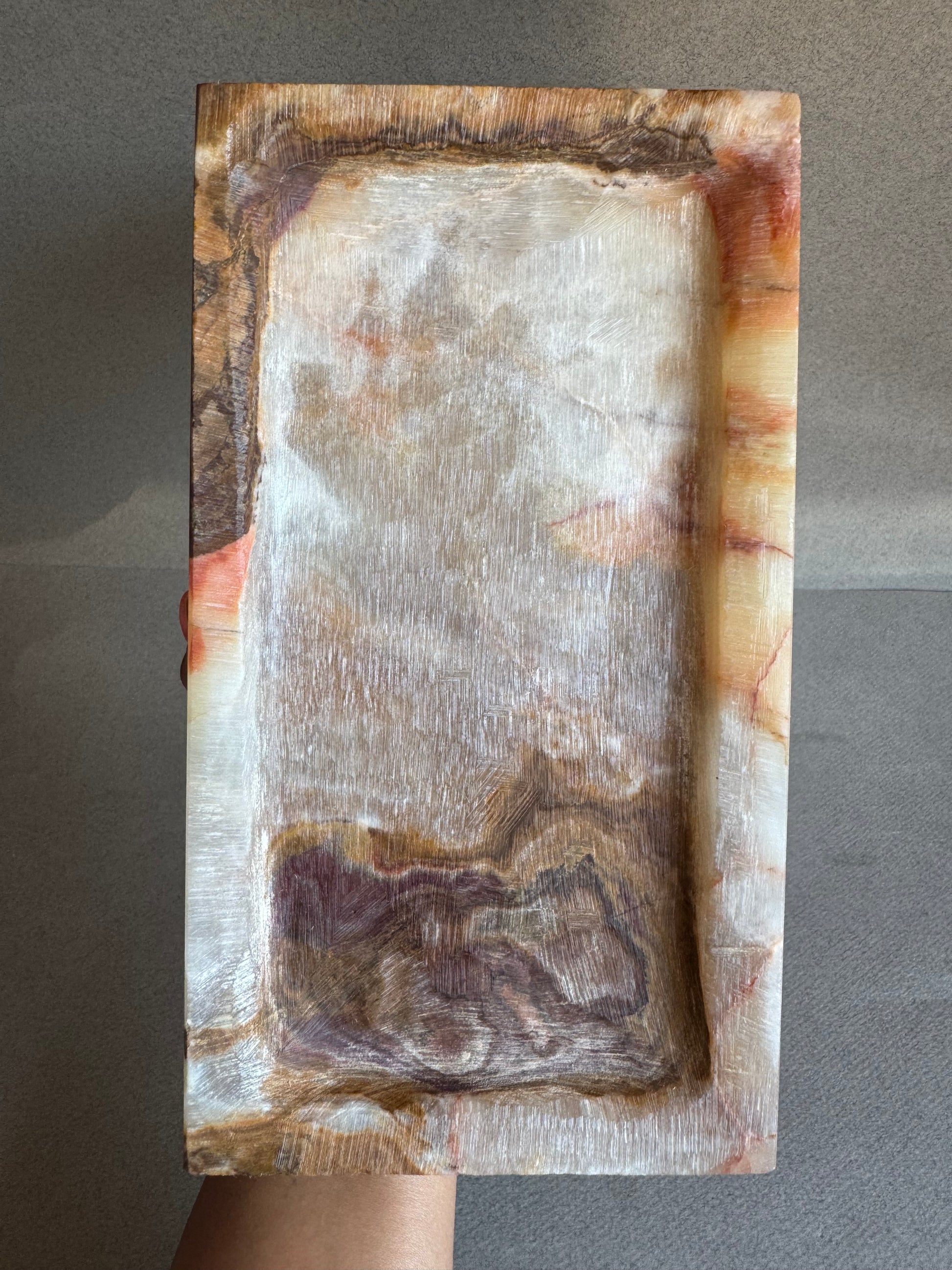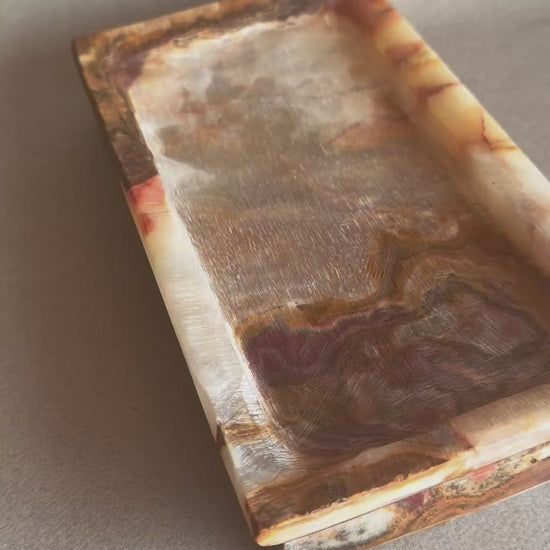 Plum, copper, cream, and caramel; this rectangular onyx tray features bold layered veining that feels like ancient earth frozen in motion. The deep, sculptural color variations recall sedimentary cliffs, woodgrain, and desert minerals, grounding your space in texture and warmth.