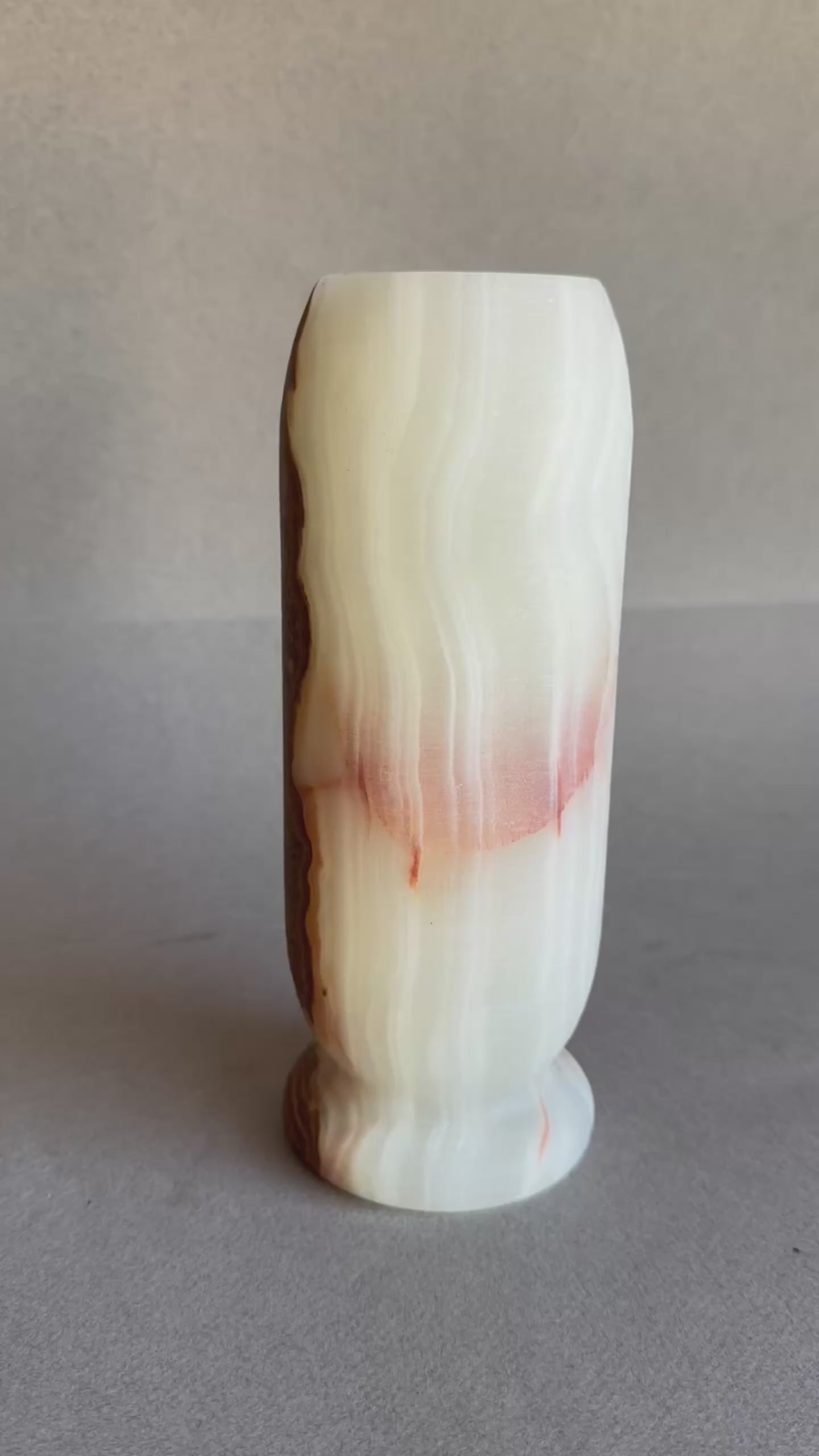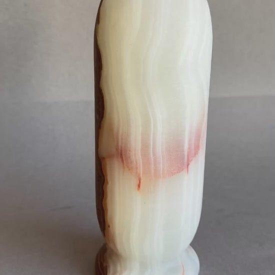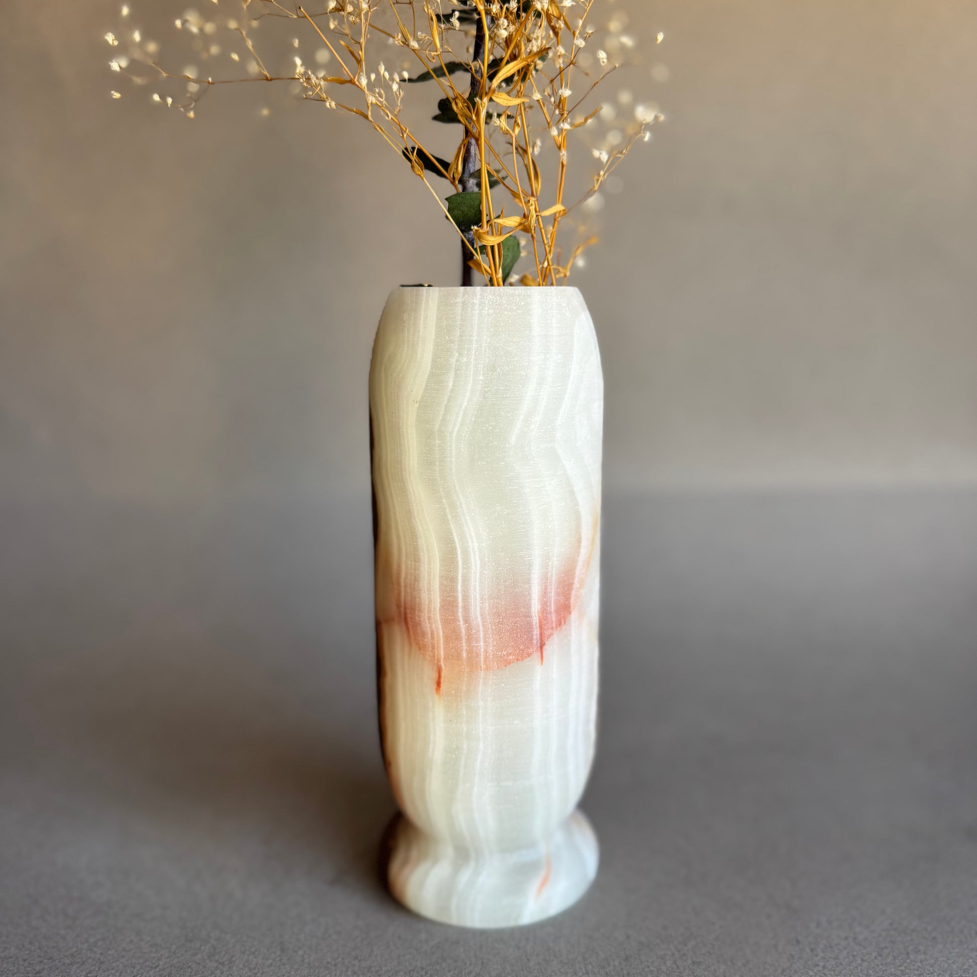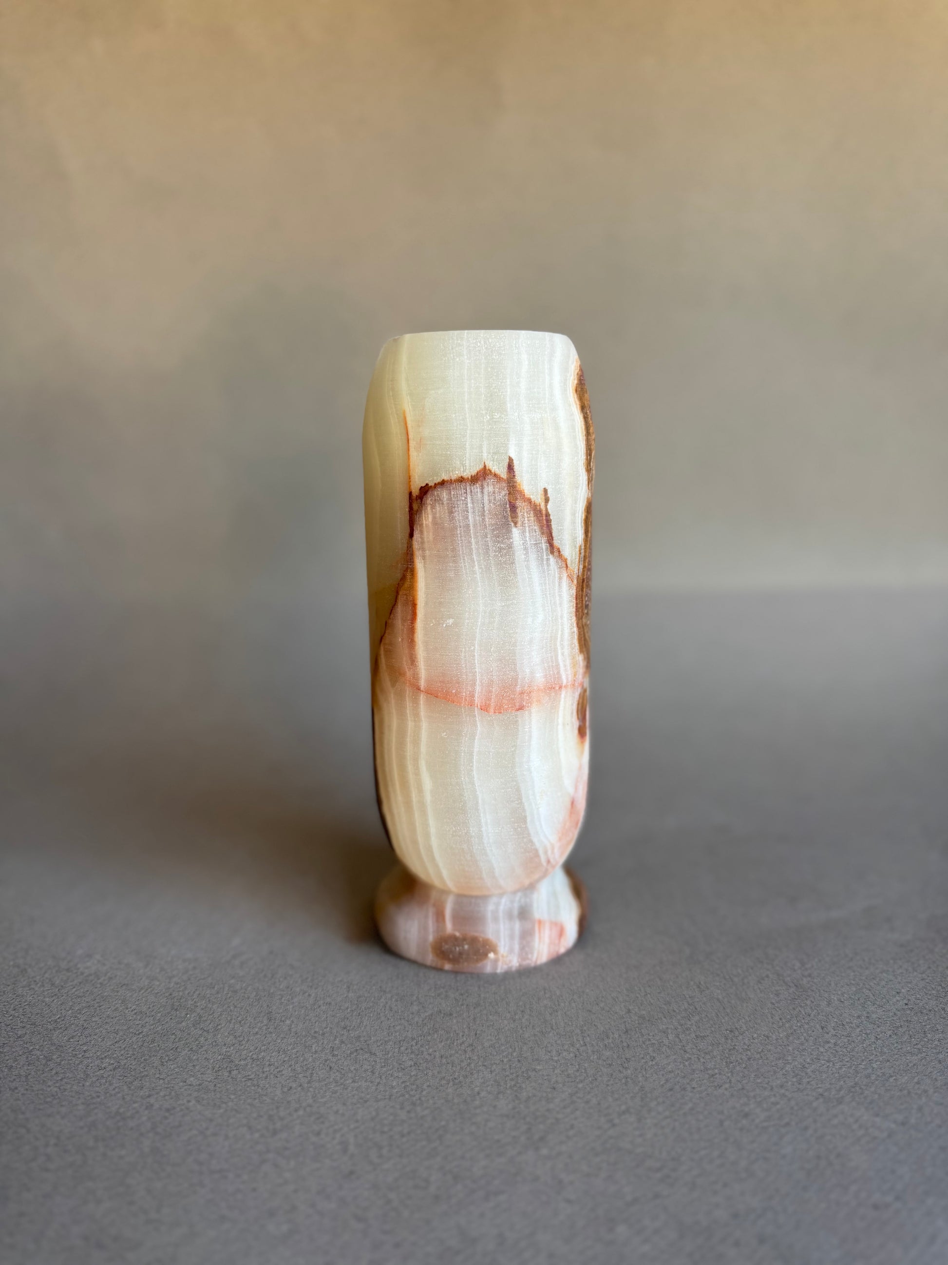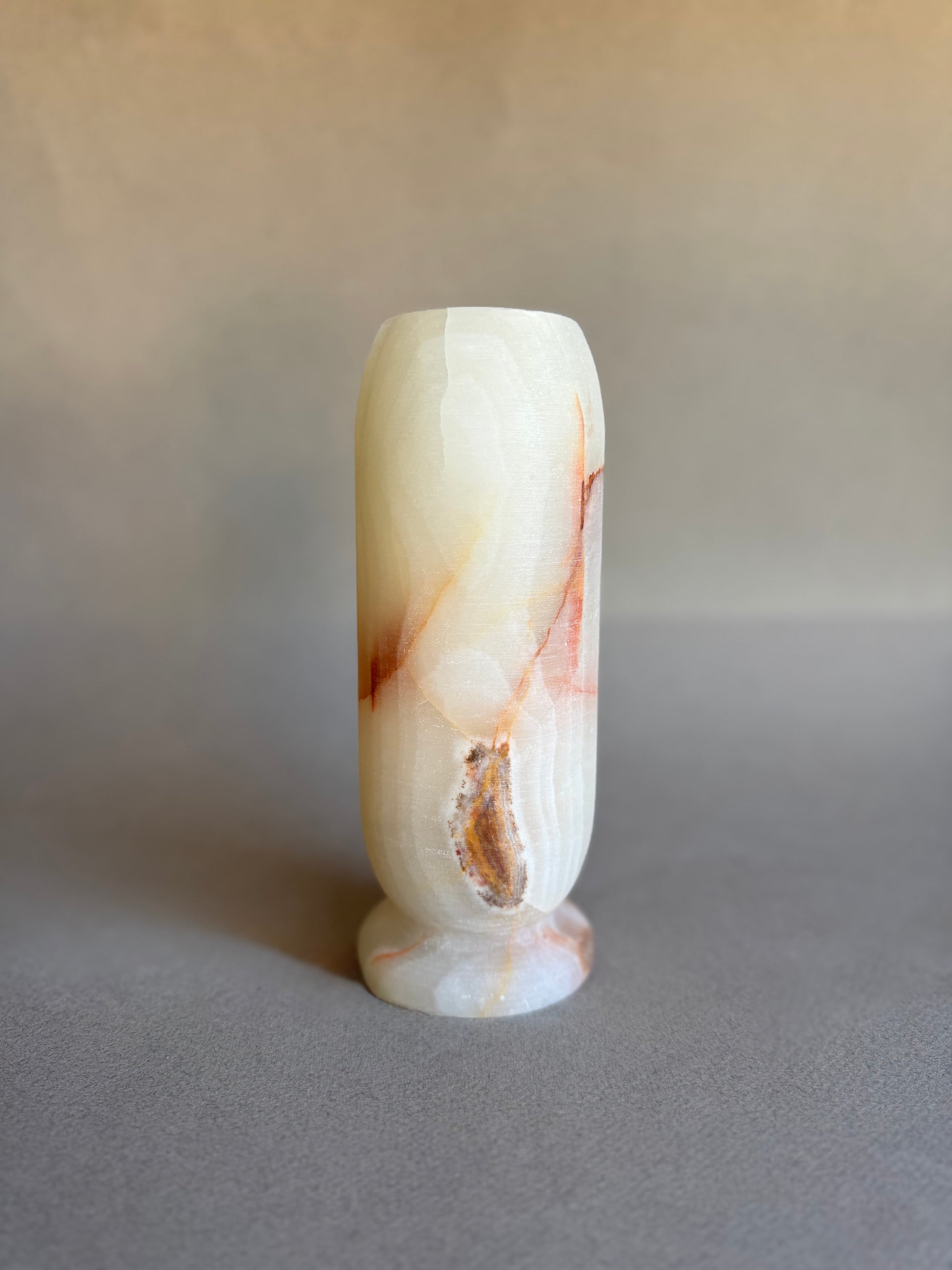Cream, burnt orange, and blush — this tall onyx vase captures the stillness of desert stone, with mineral veining that flickers softly in the light. Its form is sculptural and elegant: slender at the neck, rooted at the base, and balanced in presence.