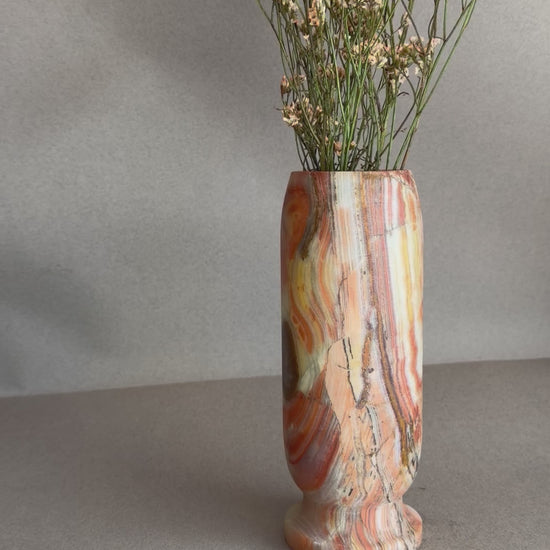Each vase is carved from a single block of natural onyx by artisans in Balochistan, Pakistan, then finished by hand in our San Diego studio. Because onyx is formed over thousands of years, no two pieces are ever alike. The vase you receive will be similar in size, shape, and overall tone to those shown, but will feature its own unique veining, banding, and color placement.