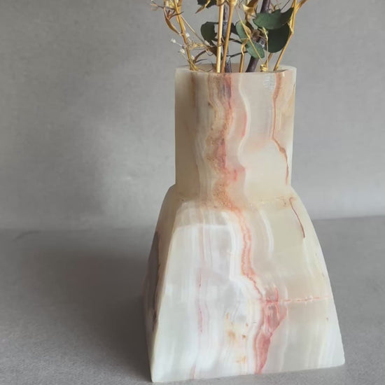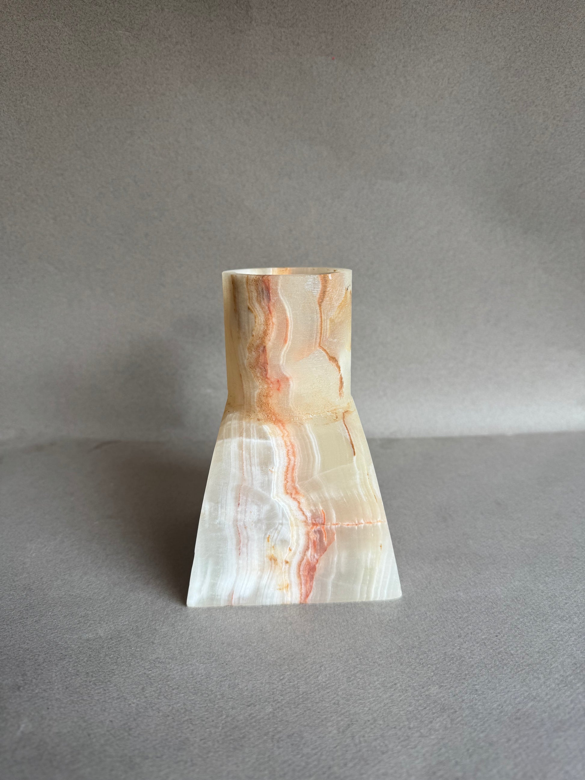 Ivory & amber; this hand-carved onyx vase glows with the warmth of desert stone. Mineral veining runs through each side, shifting in color from soft ivory to deep amber, making every angle unique.