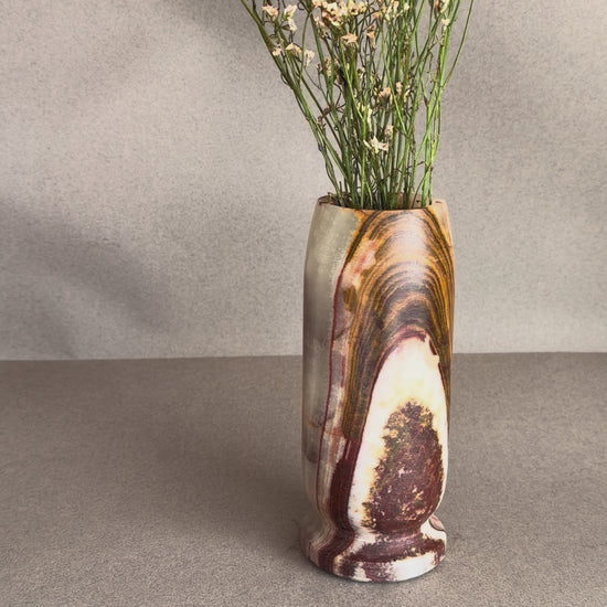 Each piece is entirely one of a kind. Variations in veining, color concentration, and pattern are natural characteristics of genuine onyx and make every vase unique.