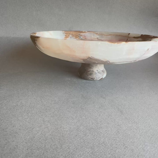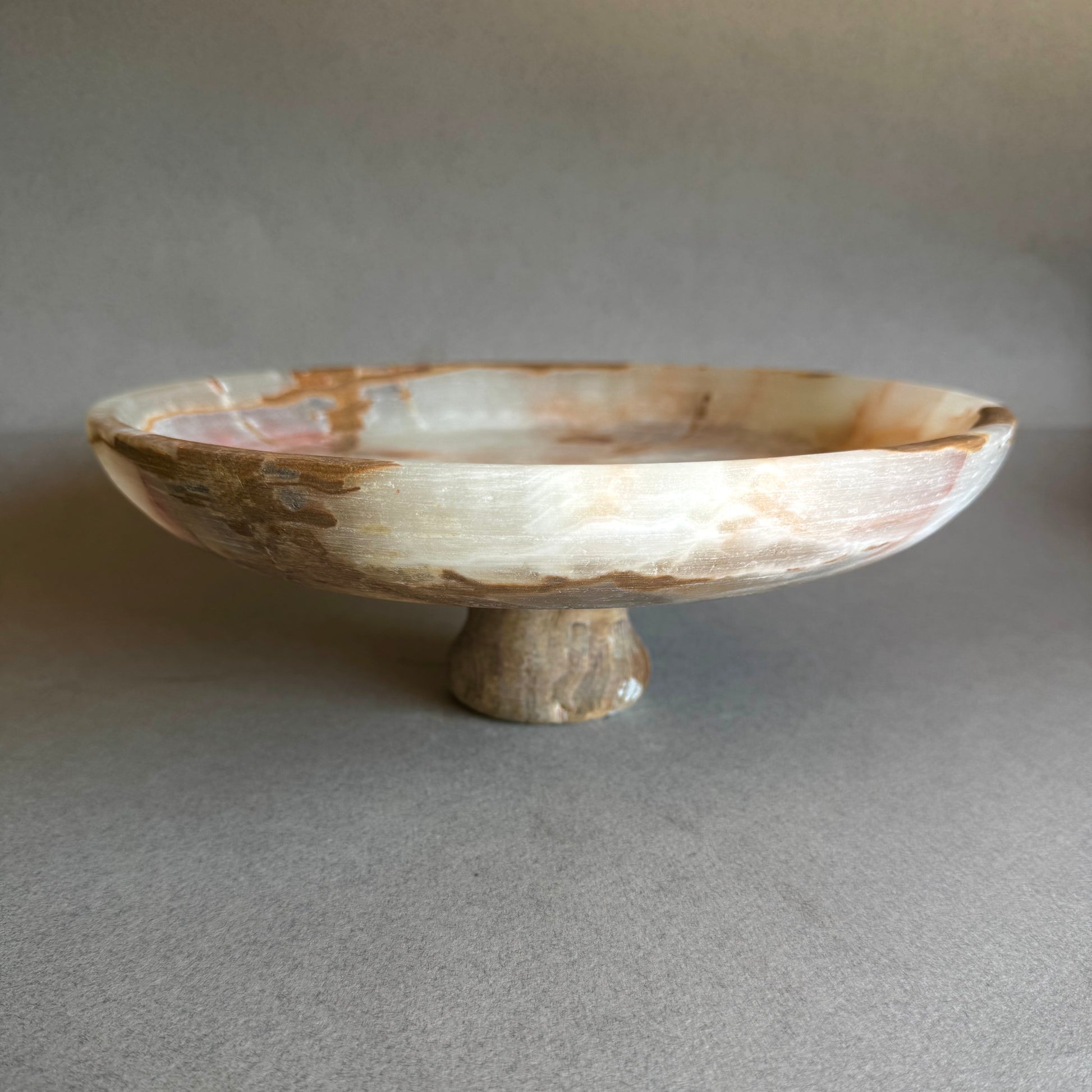 This hand-carved onyx pedestal bowl is a functional sculpture, perfect as a centerpiece fruit bowl, jewelry catchall, or decorative display piece. With its wide, shallow form and solid footed base, it balances strength with quiet elegance.