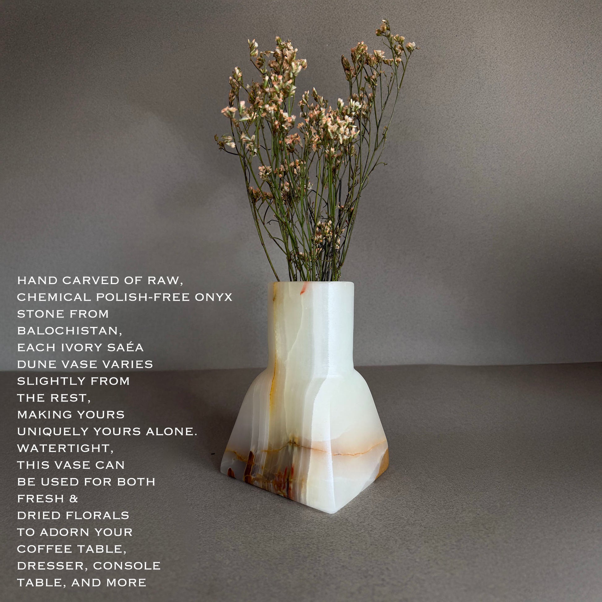 Hand-carved from raw, chemical polish–free onyx by artisans in Balochistan, Pakistan and finished with care in our San Diego studio. Sealed with food-grade beeswax only, honoring SAÉA’s commitment to natural materials, slow craft, and timeless design.