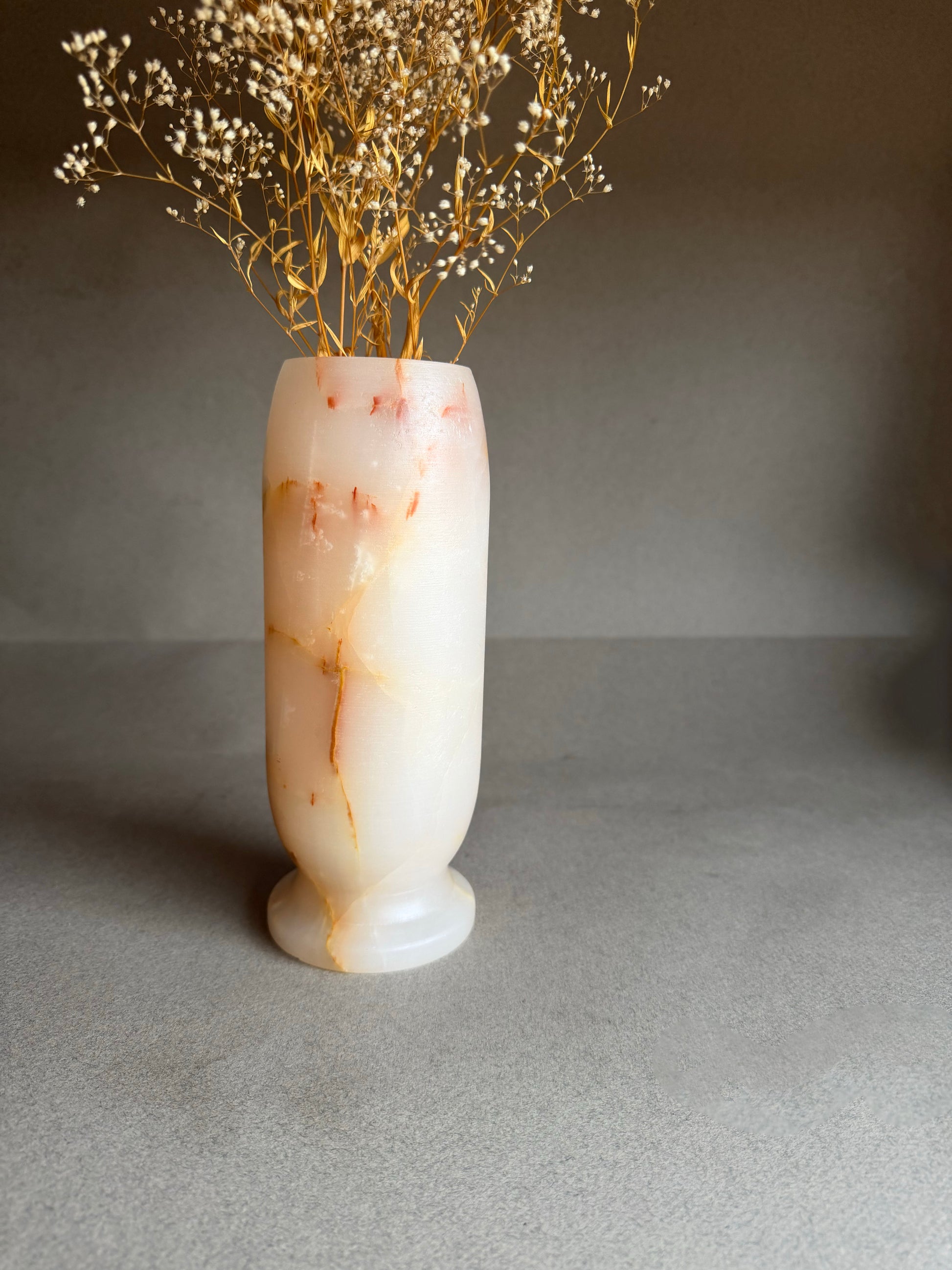 Ivory and soft stone—this hand-carved onyx vase embodies restraint and quiet beauty. Predominantly creamy white and milky ivory, the surface is gently interrupted by faint blush, honey, and sand-toned specks and wisps—subtle mineral markings that reveal themselves slowly in the light.