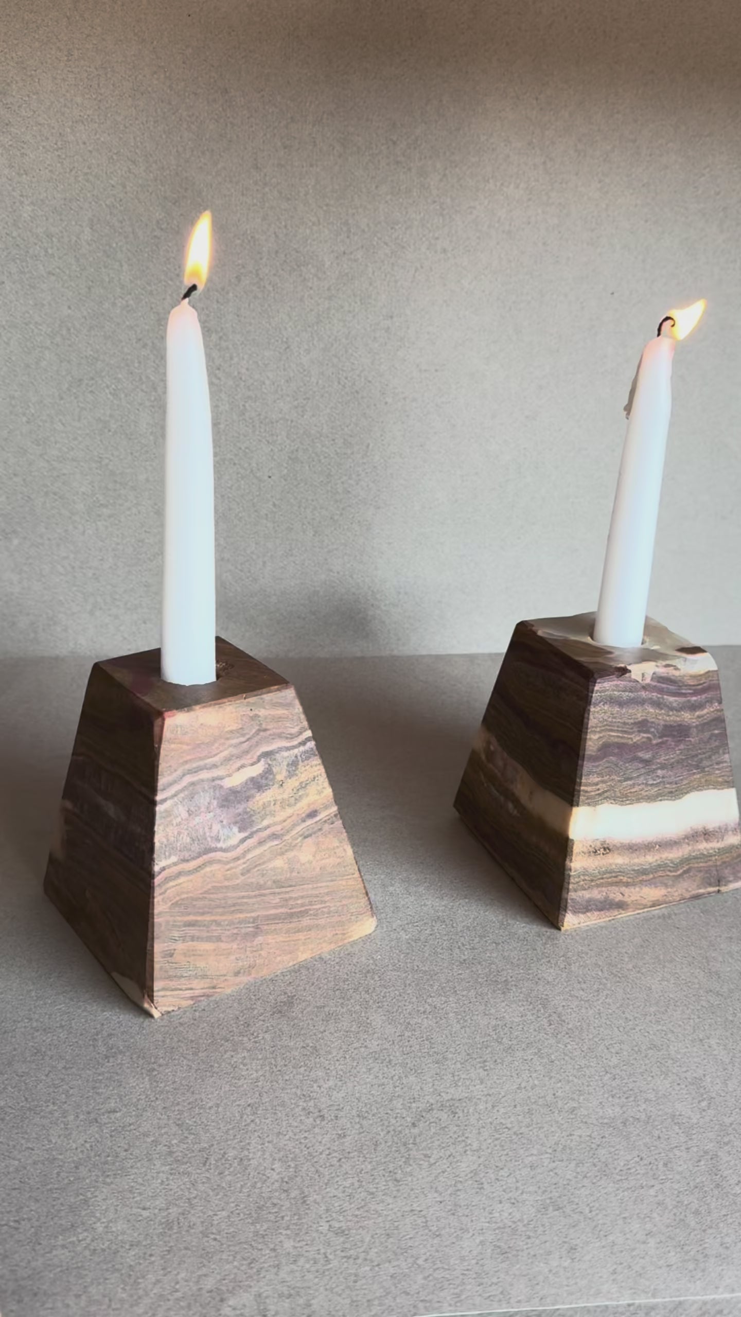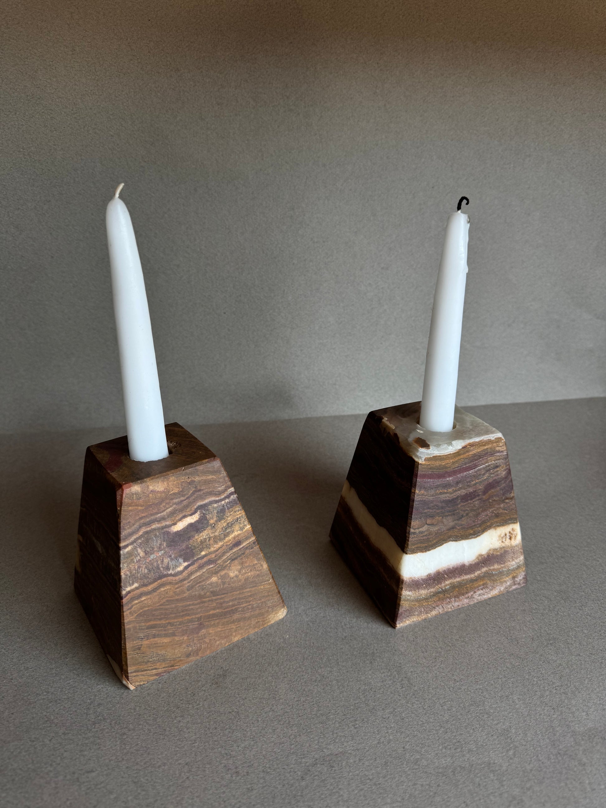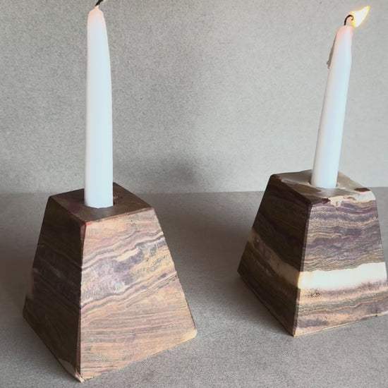 With richly banded veining and a sharp pyramidal silhouette, these hand-carved onyx candle holders bring sculptural depth and elemental warmth to any shelf, tablescape, or sacred space.