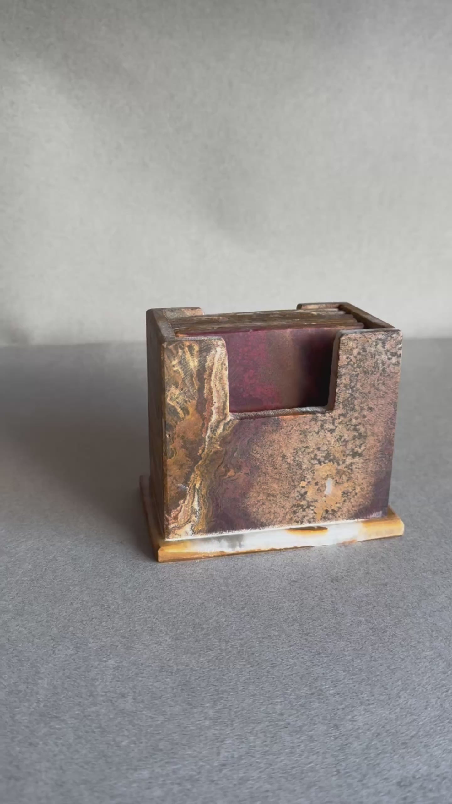 Burnt sienna, deep rust, and weathered terracotta streak through this moody stone set—each coaster an artifact of the earth’s inner fire. This 6-piece set includes five hand-carved onyx coasters and a sculptural stone holder, cut from the same richly veined mineral and finished to a soft matte glow.