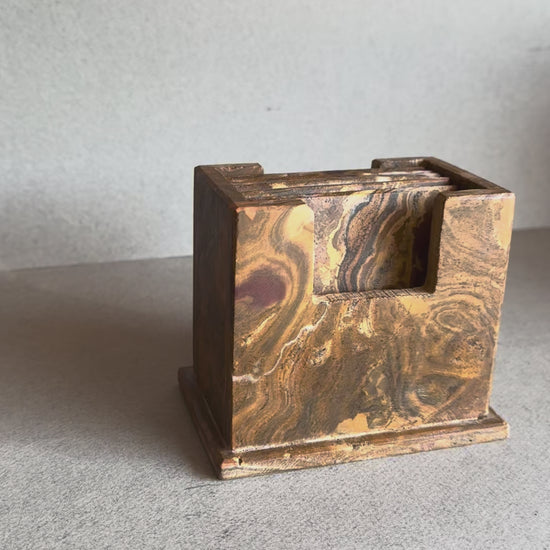Swirls of rust, ochre, and deep maroon flow across richly pigmented stone—each coaster a layered terrain of earth and fire. Hand-carved into crisp square tiles and paired with a matching sculptural holder, this five-piece set turns everyday drinks into a quiet ritual of grounding beauty.