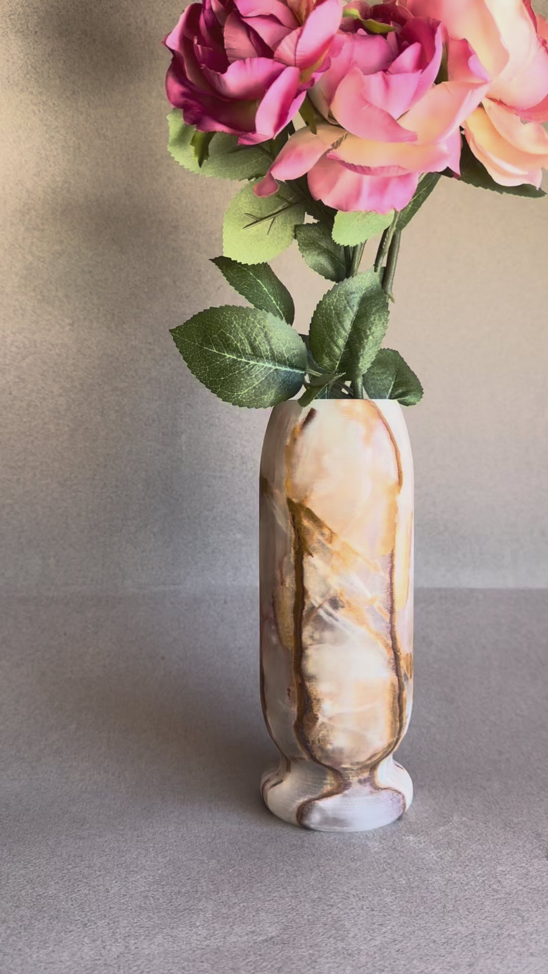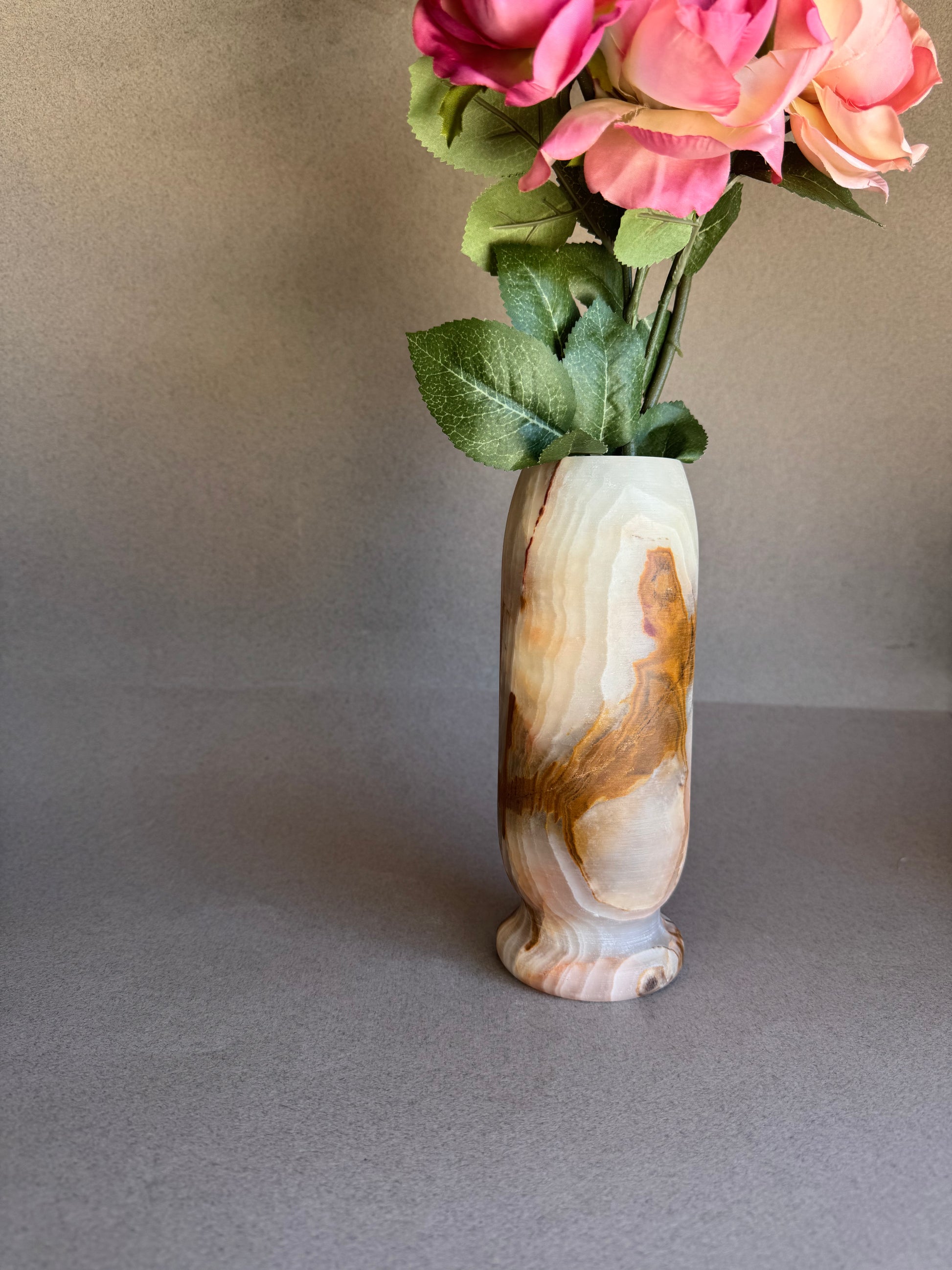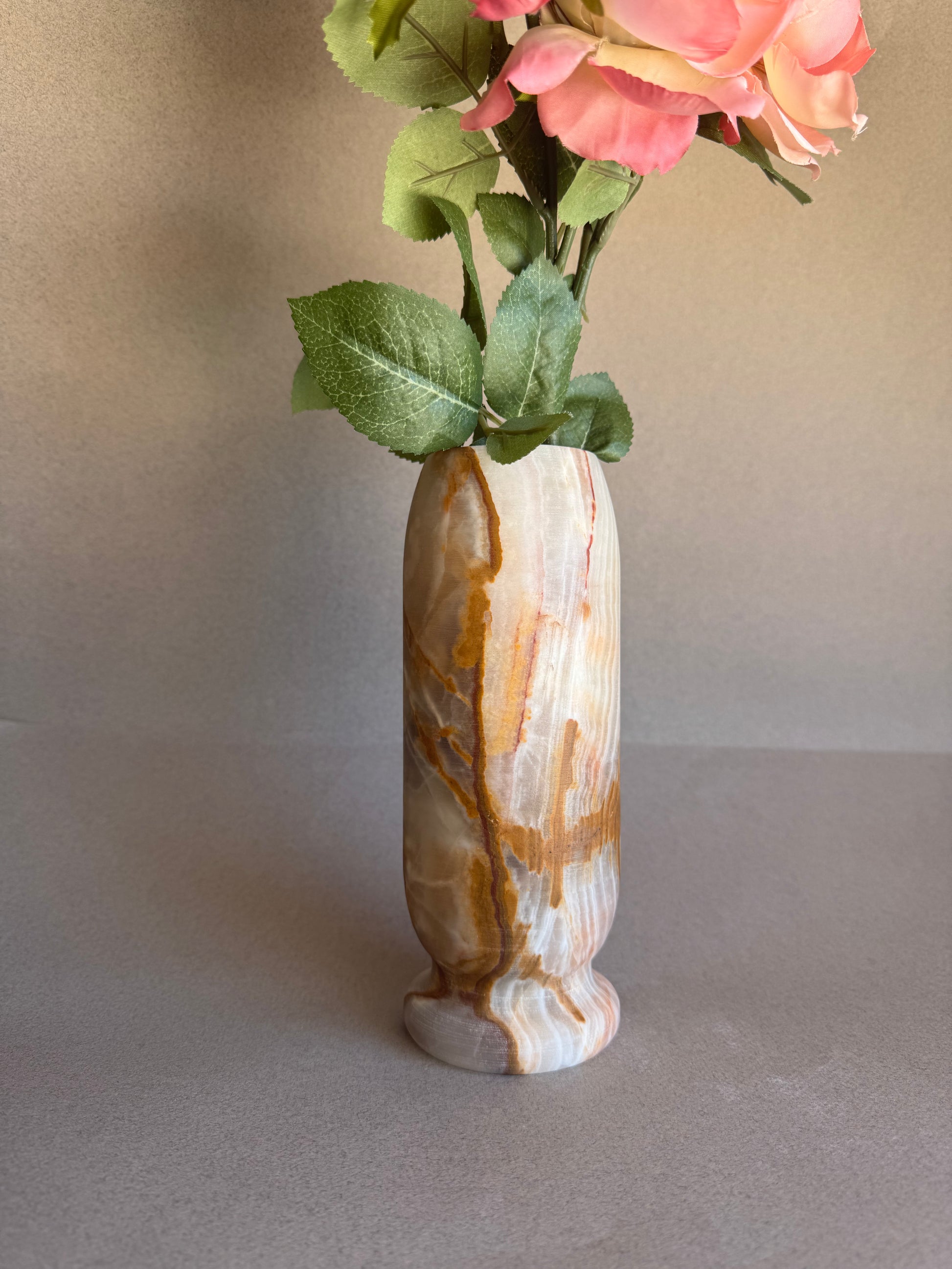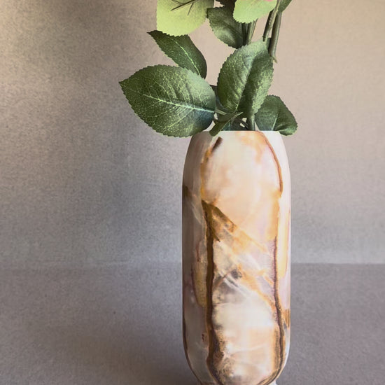 Pink, peach, and amber—this hand-carved onyx vase carries the grounding depth of natural stone. Layers of mineral veining shift from deep chestnut to soft ivory and warm amber, creating a marbled surface that feels both ancient and modern.