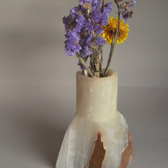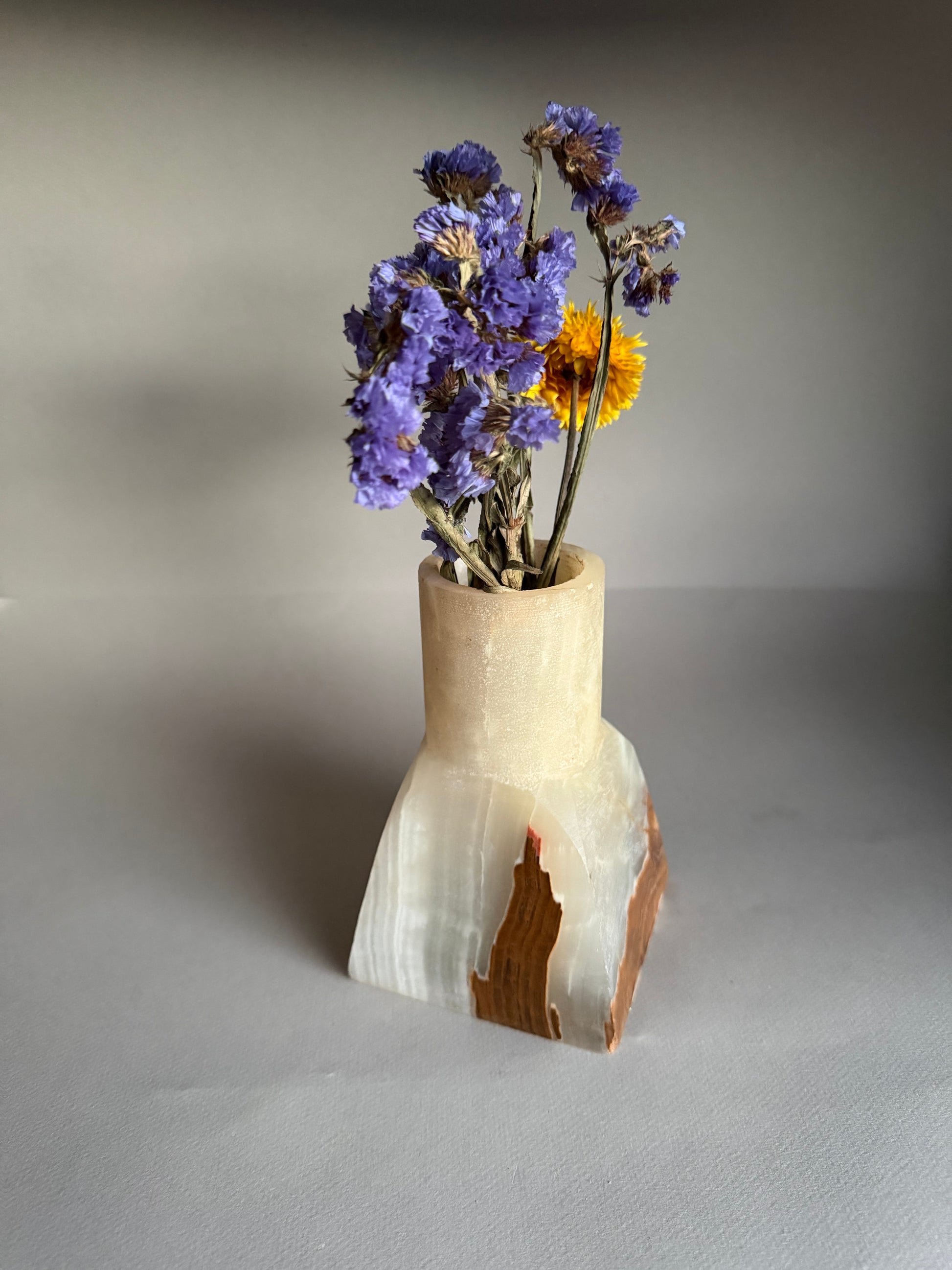 Rust & cream; this hand-carved onyx vase is sculptural by design and timeless in presence. Its geometric silhouette, with a broad square base and cylindrical neck, creates a striking balance between strength and elegance. The mineral veining shifts with the light, making each vase one of a kind, formed over millions of years by the earth.