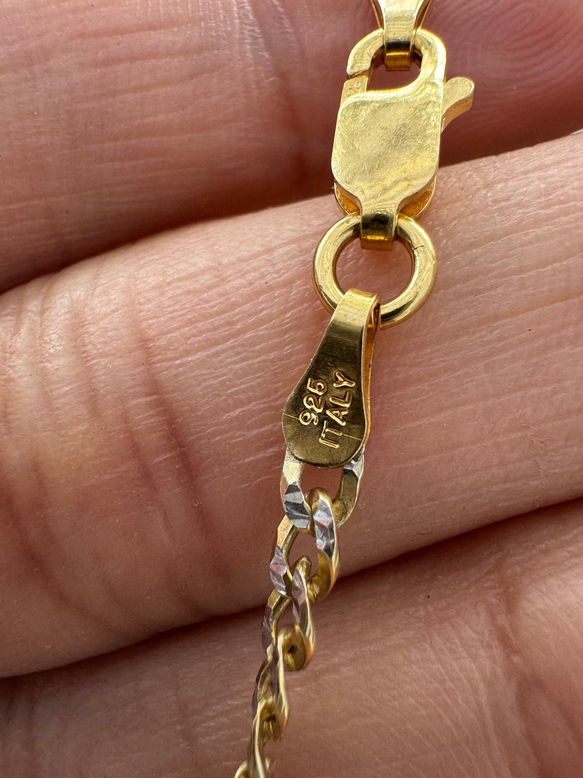 • Chain: Sterling silver two tone 925 Curb chain, Italian made, 16” length, stamped 925 ITALY