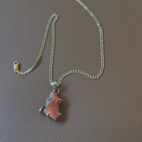 Each pendant is held in a sterling silver prong setting that preserves the organic outline of the stone. It hangs on a 16-inch Italian-made two tone sterling silver Curb chain stamped 925 ITALY, known for its high quality and timeless craftsmanship. The pendant itself measures about 1 x 0.5 inches, though every piece varies due to the freeform cut.