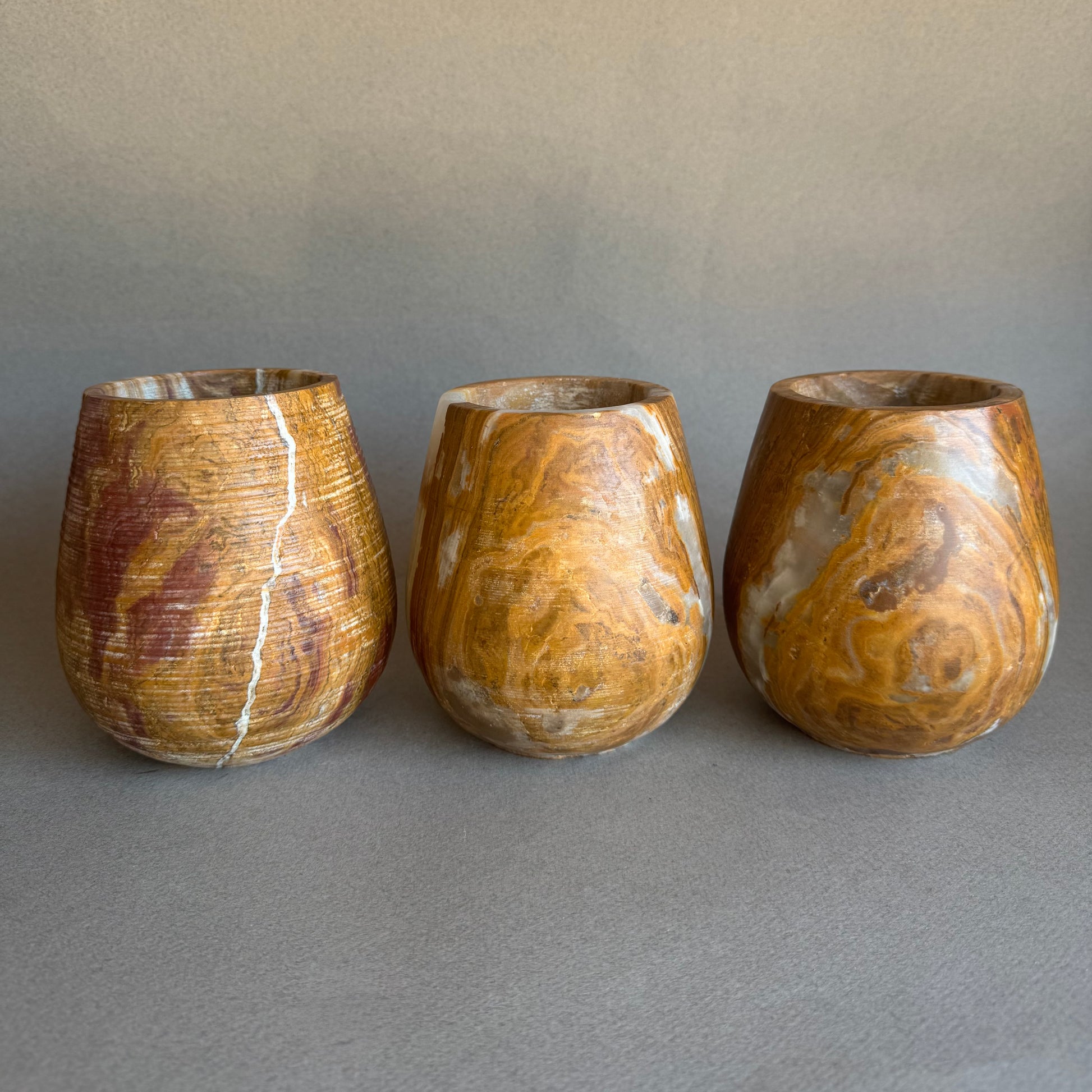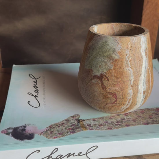 Clay, rust, and dusk—this vessel carries the warmth of sunbaked stone and deep desert light. With swirling veining in ochre, rosewood, pale green, and charcoal, each piece is hand-carved from natural onyx into a soft, rounded silhouette that feels both ancient and modern.