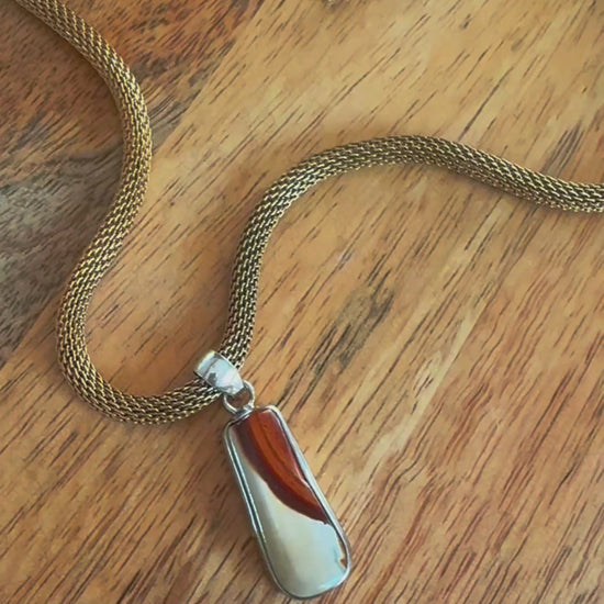 Elevate your everyday style with the grounded beauty of natural jasper. This one-of-a-kind SAÉA pendant necklace features a long oval/rectangular jasper stone, rich with earthy tones and organic veining, bezel-set in a sleek 14k gold vermeil frame. Suspended from a weighty Italian-made Franco mesh chain, it drapes effortlessly against the skin; timeless, modern, and full of quiet character.