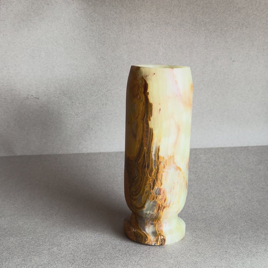 Because this vase is carved from a single block of onyx, each piece will vary slightly in color, veining, and pattern placement. Your vase will be similar in tone and form to those shown, but not identical—making each piece uniquely yours and yours alone.