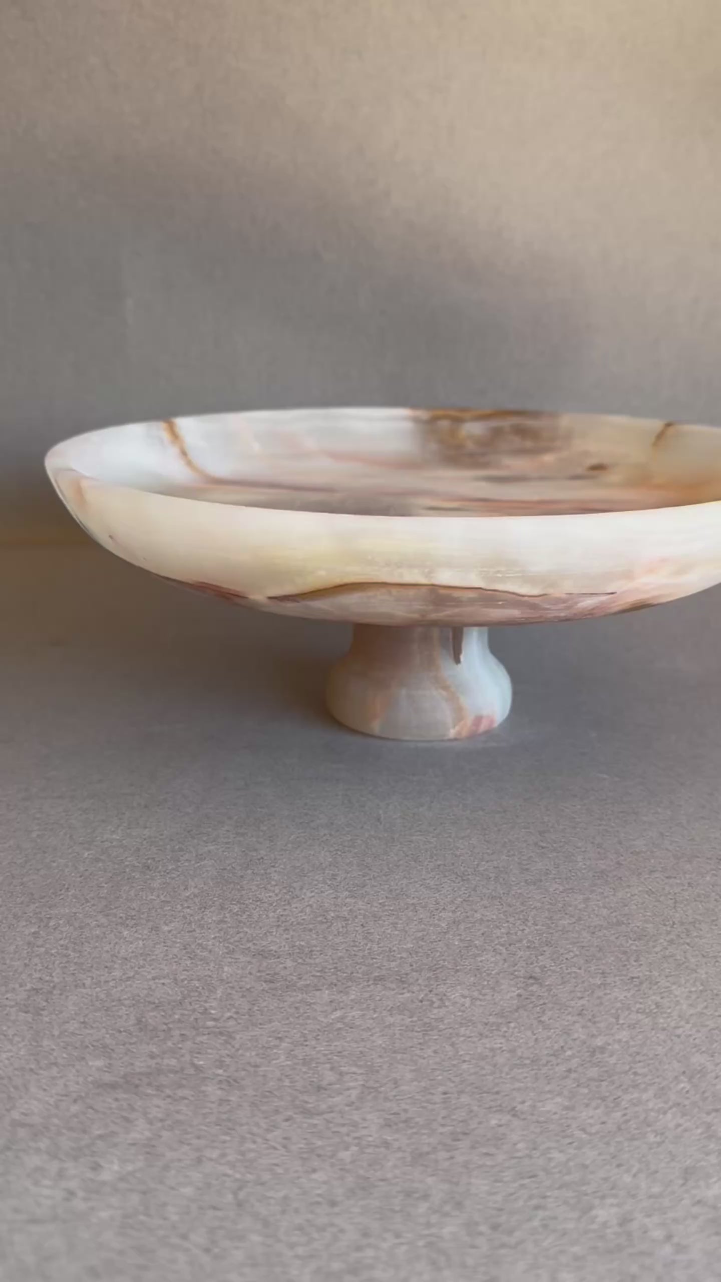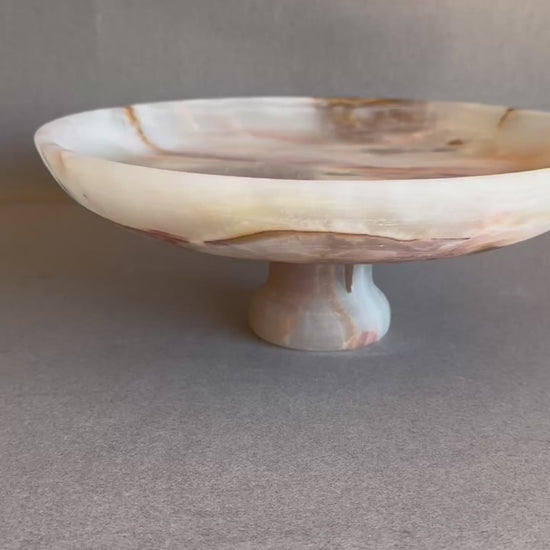 This hand-carved onyx pedestal bowl is a functional sculpture, bringing raw elegance and quiet strength into your home. With its wide, shallow form balanced on a solid footed base, it serves beautifully as a centerpiece, fruit stand, or striking display object.
