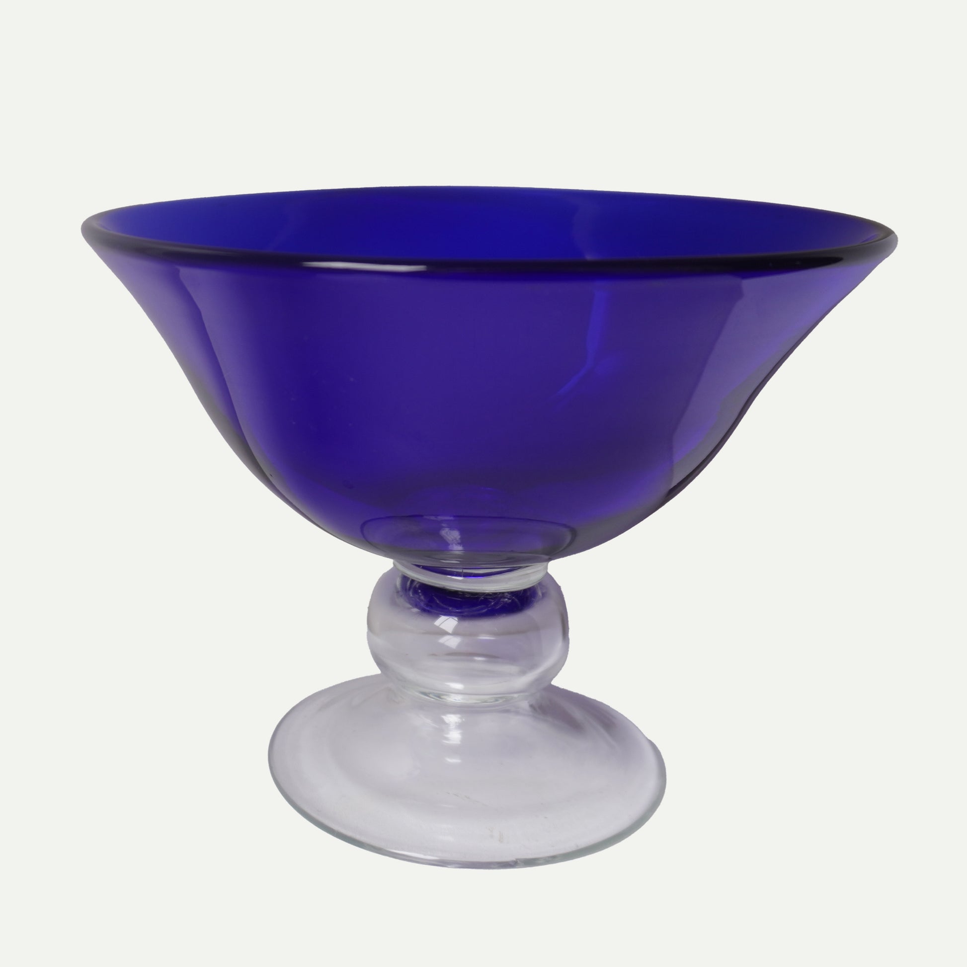 A stunning example of mid-century glass artistry, this cobalt blue compote bowl features a dramatic flared silhouette, a sculptural clear-glass pedestal base, and a deep, vibrant hue that catches the light beautifully. A versatile statement piece, it effortlessly complements both vintage and contemporary interiors.