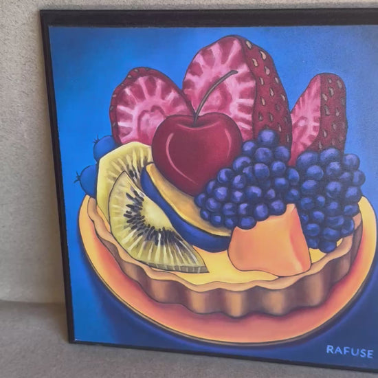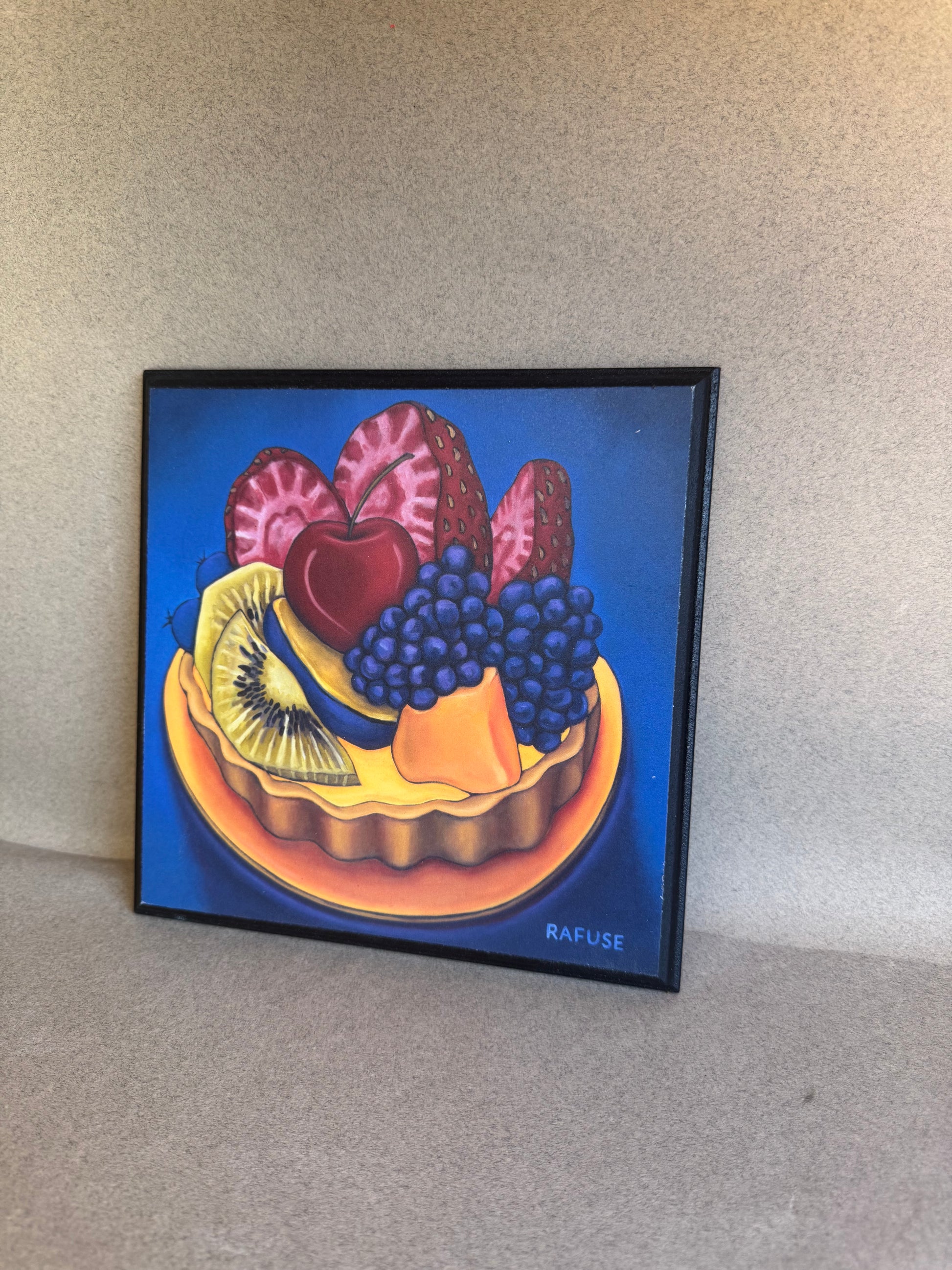 Bright, bold, and full of flavor. This square wall plaque features a colorful fruit tart painted by artist Rafuse, known for his playful and vibrant still-life artworks.